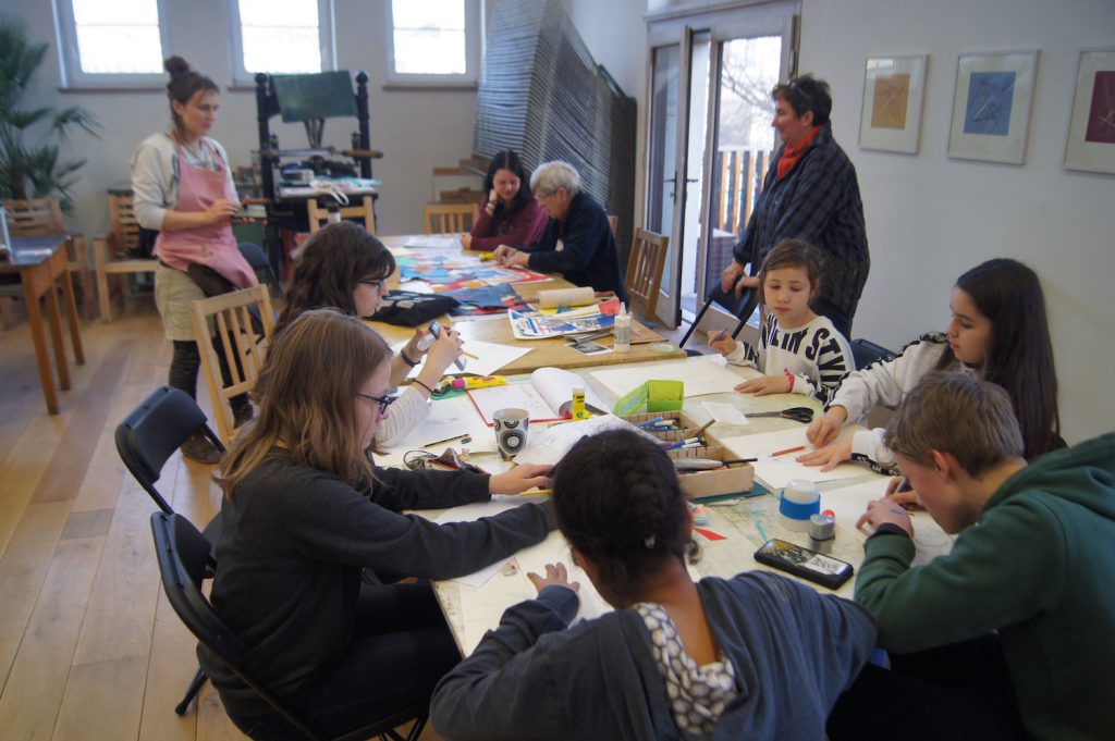 Unsere Ferien-Kunst-Werkstatt war toll! So viele schöne Bilder und Drucke sind entstanden. Jeder hat etwas Neues ausprobiert. Manche haben an der Staffelei gemalt. Andere haben mit vielen Farben gedruckt. Manche haben ihr Bild alleine gefunden. Andere waren gemeinsam kreativ...