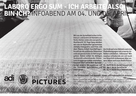Infoabend Uhr der Autodidaktischen Initiative e.V. und des Centro di Palmetta aus Terni, Italien am 5. April um 18:30 Uhr im Café Yellow. 13 Tage lang werden wir uns im September gemeinsam mittels Fotografie und Film mit dem Thema Arbeit beschäftigen. Es soll um die politische Dimension und um persönliche Erfahrungen gehen. Dabei sollen im stetigen Austausch untereinander Einzel- und Gruppenprojekte entstehen. Geplant sind neben dem Kennenlernen anderer Perspektiven auf die Thematik Exkursionen und Interviews. Am Ende soll eine Website und eine Plakatkampagne mit unseren Arbeiten entstehen. Interesse? Wir machen Infoabende um mit euchins Gespräch zu kommen über unsere Ideen und eure Bedürfnisse: