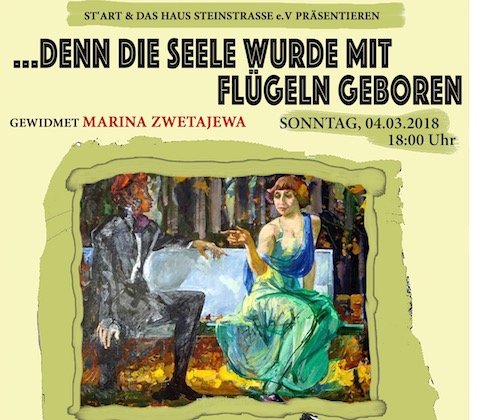ein Marina Zwetajewa gewidmeter literarisch- musikalischer Abend des Theaterstudios “St.Art” in russischer Sprache: Спектакль основан на дневниковой прозе и стихах замечательного русского поэта Марины Цветаевой. Необычная проза о поэзии, необыкновенные стихи, неповторимые отрывки из очерков Цветаевой “Моя Германия” и “Мой Пушкин”, в которых описывается душа ребенка погружающегося в стихию поэзии. The play is based on the diary prose and poetry of the remarkable Russian poet Marina Tsvetaeva. Unusual prose about poetry, extraordinary verses, unique excerpts from Tsvetaeva’s essays “My Germany” and “My Pushkin”, in which the soul of a child is absorbed into the realm of poetry.