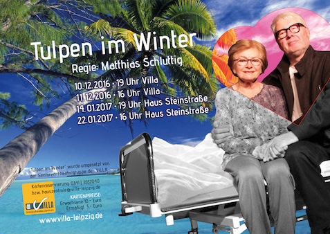 Seit einem Jahr probt im soziokulturellen Zentrum „Die VILLA“ eine Seniorentheatergruppe an einem selbstentwickelten Theaterstück. Die 9 Mitglieder der Gruppe fanden sich über eine Annonce in der LVZ, viele von ihnen beleben damit eine alte Leidenschaft wieder, als Cabarettliebhaber und Amateurschauspieler waren sie in jungen Jahren bereits aktiv. An ihrem ersten selbstverfassten Stück schrieben sie ein halbes Jahr. Es heißt „Tulpen im Winter“ und handelt von einer älteren Dame, die mit ihrem neuen Partner in den Süden verreisen möchte, statt dessen jedoch im Krankenhaus erwacht, wo sie die Diagnose Schlaganfall erhält. Sie steht vor einer schweren Entscheidung, soll sie für einen romantischen Südseeurlaub ihr Leben riskieren, oder verschiebt sie das große Abenteuer, auf unbestimmte Zeit, vielleicht für immer. Dem Thema Alter und Verfall steht die späte Liebe entgegen, die der Gruppe bis zuletzt als das größte Abenteuer des Lebens gilt. Während der wöchentlichen Proben wechselt sich ernsthaftes Reflektieren mit Spiel und Spaß ab. Auch wenn in das Theaterstück viele ernsthafte, persönliche Erinnerungen einfließen, wird viel ausprobiert. Dabei beweisen die Darstellerinnen Mut und Humor, Sprechtheater, Figurentheater, Slapstick, Choreographien, kommen in unterhaltsamer Mischung zum Einsatz.